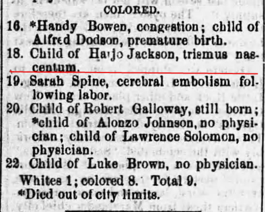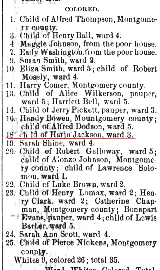 I could not find Harjo in any more records for years. He didn’t appear in the 1870 census with his mother and siblings. Recently I found three items in the Montgomery Advertiser, all were for deaths of infants of Harjo Jackson.