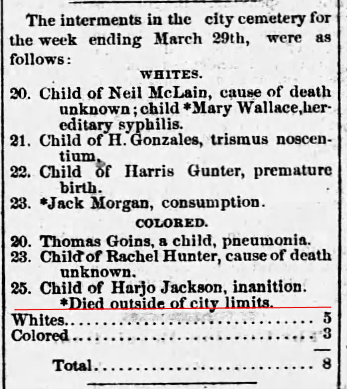 On September 18, 1883, a child of Harjo Jackson died of Neonatal tetanus (trismus nascentium), a form of generalised tetanus that occurs in newborns. Infants who have not acquired passive immunity from an immunized mother are at risk. It usually occurs through infection of the unhealed umbilical stump, particularly when the stump is cut with a non-sterile instrument. (from Wikipedia)