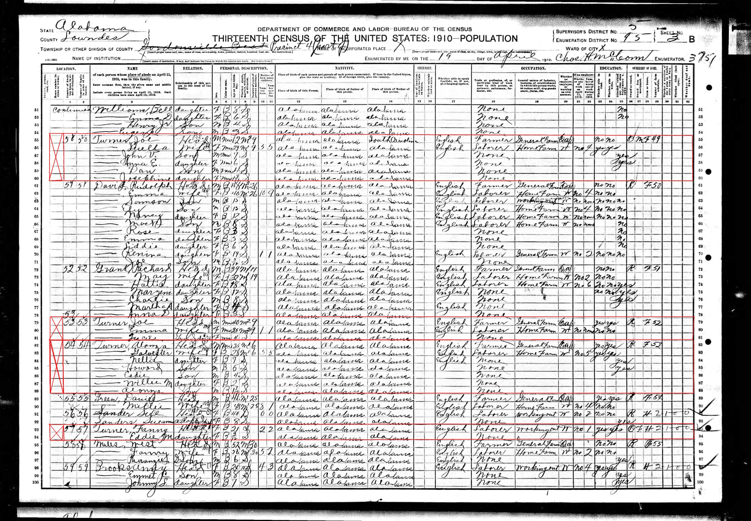 Alonza Turner was born on Thursday, April 14, 1910 in Lowndes County, Alabama. He was the 5th child of 35 year old farmer Alonza Turner and his wife 28 year old Galvester. The family included four other children: Nellie (7), Howard (5), Eddie (4), and Willie M. (2). Galvester had birthed five children and all five were alive. According to the 1910 Census, both parents were literate. The two oldest children had attended school. They rented their land.