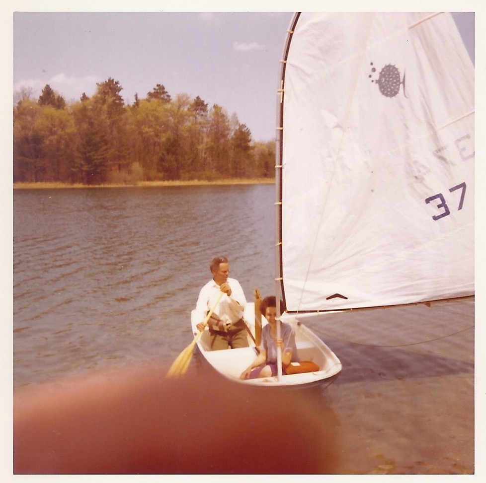 Henry is taking me out on Lake Idlewild in the little sailboat. It was used to practice the skills needed to sail the big sailboat on the Detroit River. You can read about that boat here -> Sailing Log Detroit River – 1970
