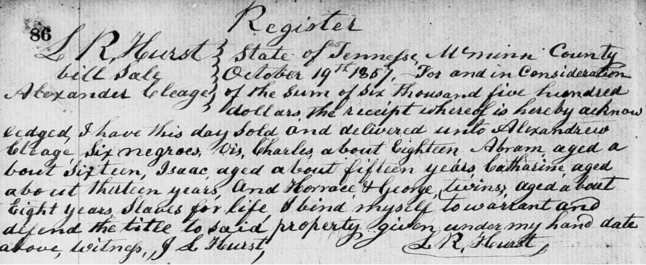 State of Tennessee McMinn County October 19th 1857, For and in Consideration of the sum of Six thousand five hundred dollars, the receipt whereof is hereby acknowledged, I have this day sold and delivered unto Alexander Cleage Six negroes, Vis, Charles, about eighteen, Abram, aged about sixteen, Isaac aged about fifteen years, Catharine, aged about thirteen, years, and Horrace & George, twins, aged about eight years, slaves for life, I bind myself to warrant and defend the title to said property given under my hand date above, witness, J. S. Hurst, L. R. Hurst