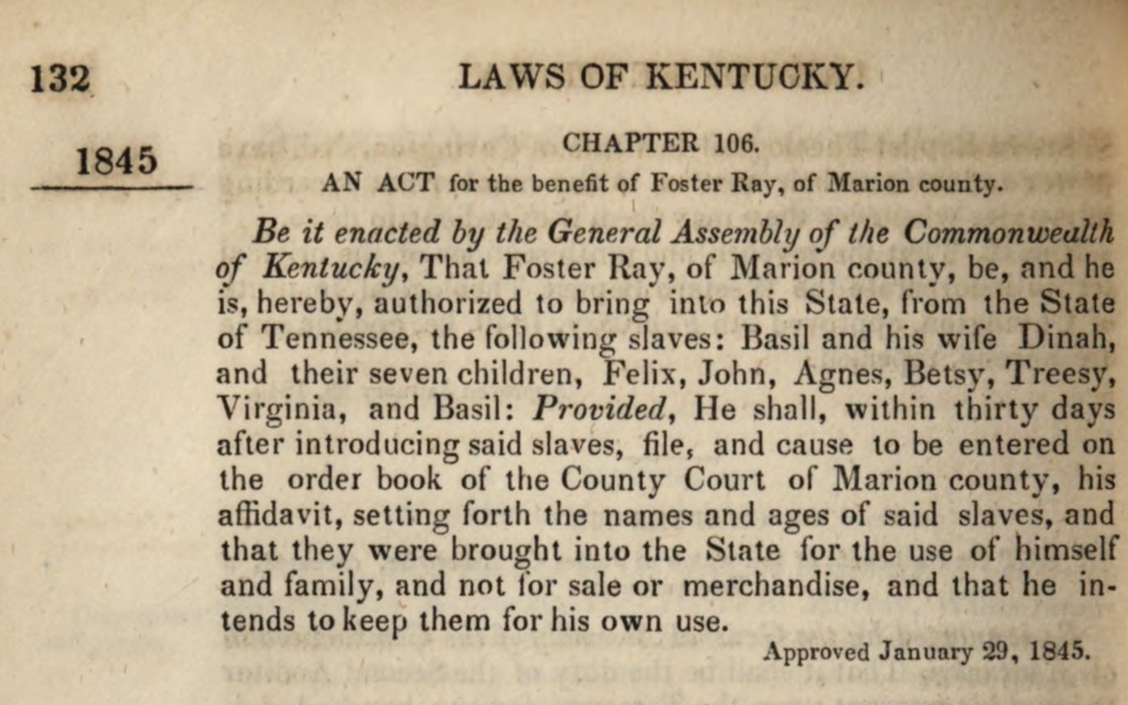 I found several news items from 1845 that appeared in the local Lebanon paper and mentioned that Foster Ray had asked for and received permission to bring in nine enslaved people for his “personal use”. At this time it was illegal to bring people into Kentucky and resell them, but keeping them for yourself was okay. I assumed that these were nine unrelated people until I found another item saying that the group was a family, Basil and Dinah and seven of their children – Felix (12), John (11), Agnes (10), Betsy (8), Treesy (6), Virginia (2) and Basil (1).