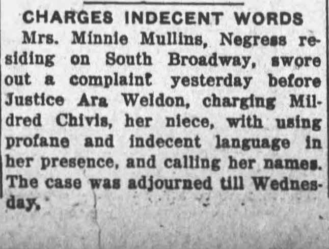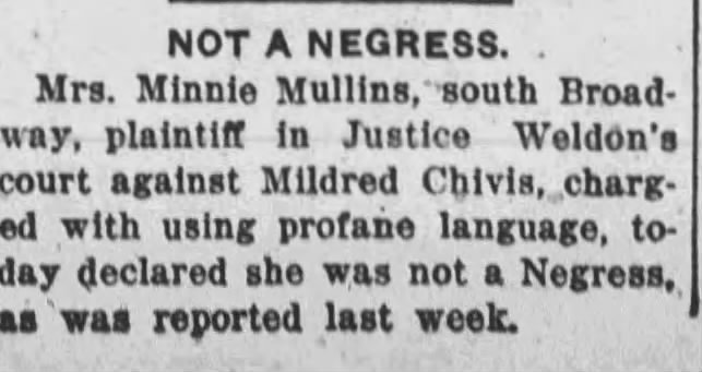While working on yesterday’s Minnie Mullins post, I came across these two news items. It was jarring to see “Negress” used in the first article and then a week later Minnie declaring, I’m sure to the amusement of the newspaper people, that she was not a “Negress”. But, good job Aunt Minnie!