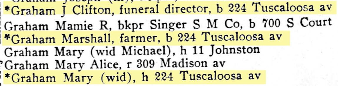 In the 1916 Montgomery City Directory, my grandfather was living with Clifton and Mary Graham. They were his “adopted family” and as far as I know not blood relations.
