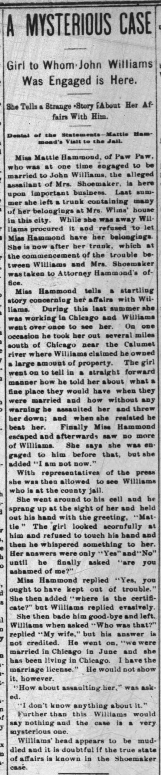 Miss Mattie Hammond, of Paw Paw. who was at one time engaged to be married to John Williams, the alleged assailant of Mrs. Shoemaker, is here upon important business. Last summer she left a trunk containing many of her belongings at Mrs. Williams’ house in this city. While she was away Williams procured it and refused to let Miss Hammond have her belongings. She is now after her trunk, which the commencement of the trouble between Williams and Mrs. Shoemaker was taken to Attorney Hammond’s office.