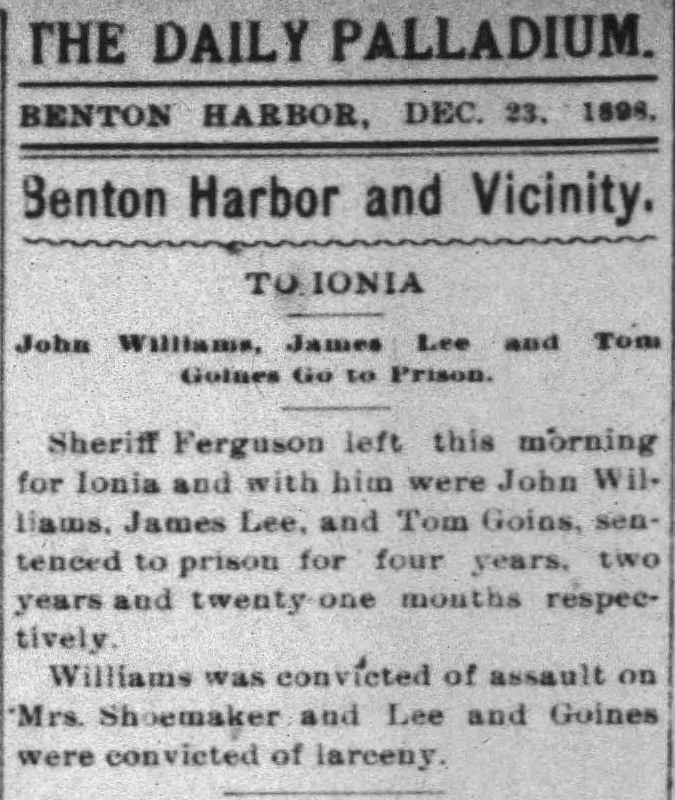 Sheriff Ferguson left this morning for Ionia and with him were John Williams, James Lee, and Tom Goins, sentenced to prison for four years, two years and twenty one mouths respectively.