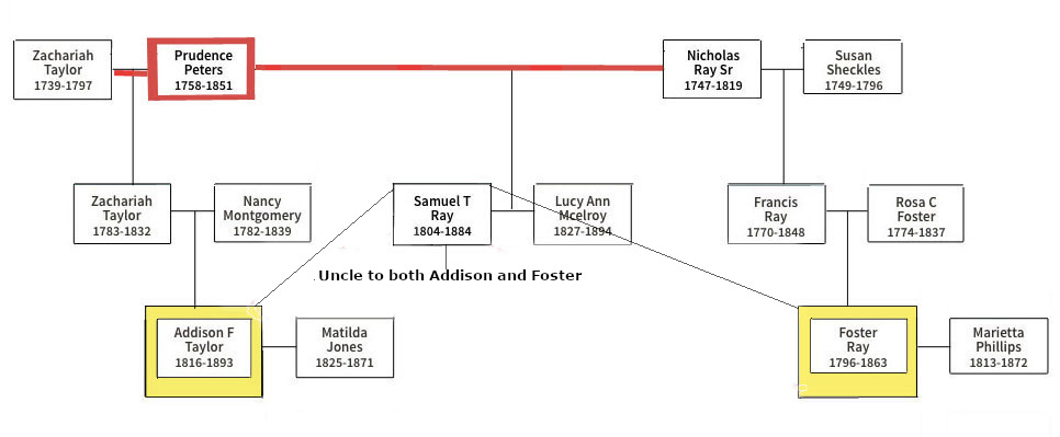 Then I noticed that a Prudence Peters showed up on both of the trees. I went back several generations, I found that Addison Taylor’s paternal grandparents were Zachariah Taylor and Prudence Peters. After Zachariah died in 1797, Prudence married Foster Ray’s widowed grandfather Nicholas Ray. Nicholas’ first wife Susan Sheckles, was Foster Ray’s grandmother.